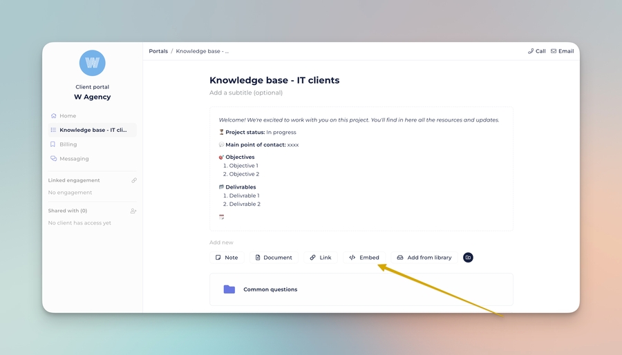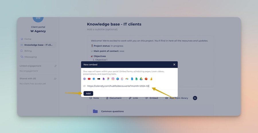 You can embed external applications in any portal workspace to give clients a seamless experience The embed will open directly in your portal.